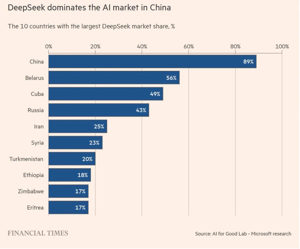 Financial Times chart showing DeepSeek’s estimated market share by country, January 2026. Source: Microsoft AI Economy Institute / Financial Times]