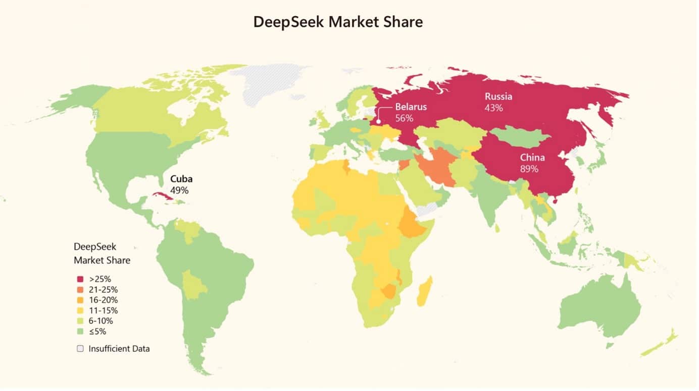 The picture outside the regulated West could hardly be more different. Microsoft’s research estimates DeepSeek’s market share at 89% in China, 56% in Belarus, 49% in Cuba, and 43% in Russia. In Syria and Iran, market shares reached 23% and 25% respectively. Across Africa—including Ethiopia (18%), Zimbabwe (17%), Uganda, and Niger—DeepSeek has established a meaningful foothold, with usage estimated at two to four times higher than in other regions. These are not marginal positions in niche markets; they represent dominant or near-dominant shares in regions that collectively account for the majority of the world’s population and, critically, its fastest-growing digital economies.